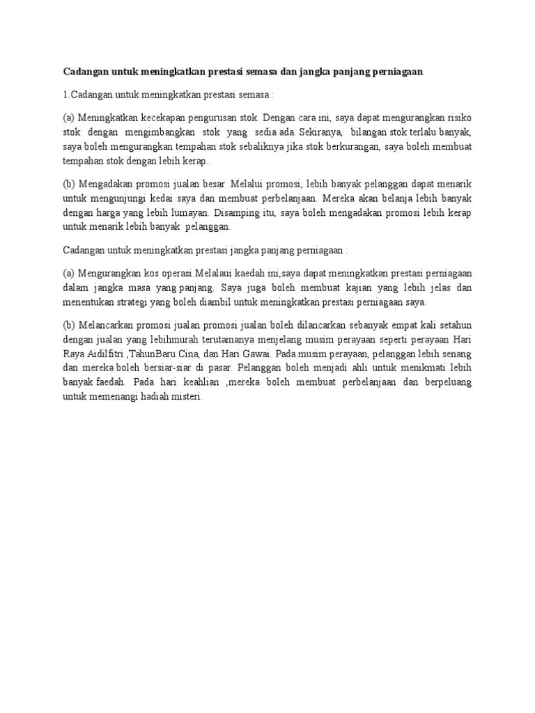 (r) cadangan jangka pendek dan cadangan jangka panjang dan (s) rumusan. Cadangan untuk meningkatkan prestasi perniagaan jangka pendeki) mengadakan. Cadangan untuk meningkatkan prestasi semasa dan jangka panjang perniagaan adalah. Pengurungan jumlah perkerja ataupun menjadual pekerja .